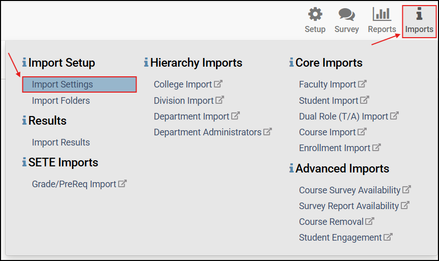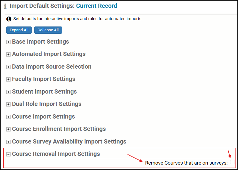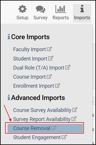 The Course Removal import is used to remove courses that have been cancelled or are exempt from the evaluation process. The import has an option to remove courses that are on surveys or to preserve them.