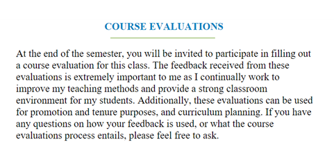 - Talk to students about the importance of Course Evaluations. Openly communicating with students about why you collect their feedback and what you do with it will show them the impact of their words and instill a culture of assessment. This leads to higher response rates and more thoughtful responses. There are various ways that you can communicate this message to students, including in-class discussion, personal email, and a syllabus statement. Check out these sample syllabus statements, written by faculty (and current Anthologists) Katie Grennell and Tina Colvin: